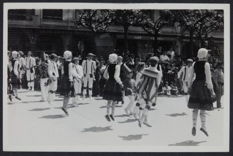 Haurrak plazan dantzatzen ageri dira, salto egiten. Atzean "Cafe Guridi" dago.