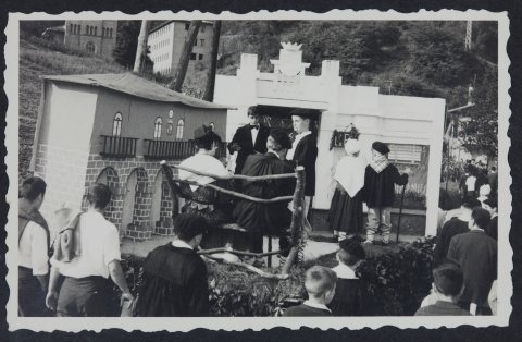Karrozak ezker aldean udaletxe antzeko bat du. Karrozaren gainean haurrak daude antzezten. Jendea inguruan ikuskizuna ikusten dago.