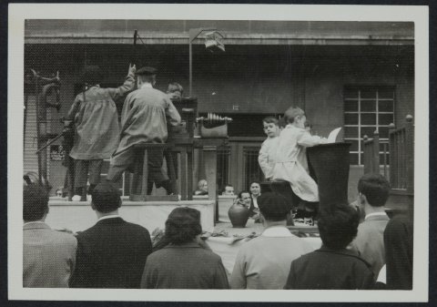 Burdiaren gainean haurrak daude antzezten. Lehen planoan ikusleak daude.
