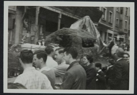 1966 urteko Euskal Jaian belarrez apaindutako karroza baten argazkia. Ikusleen ikuspegitik aterata dago argazkia.