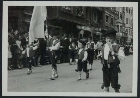 Haurrak baserritarrez jantzita daude Eibarko kaleetatik desfilatzen.
