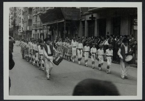 Eibarko kaleetan haurrak ezpata dantza dantzatzen. Haurrean bi gazte txistu eta danbolinarekin daude.