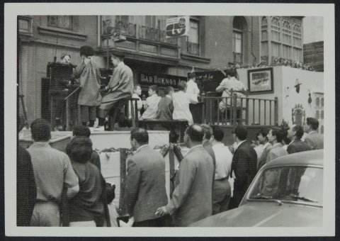 1966 urteko Euskal Jaian karroza baten bista laterala. Bizkarrez agertzen dira ikusleak.
