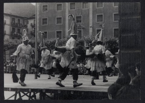 Zubietako "zanpantzarrak" oholtza baten gainean daude, plaza batean, dantzan.