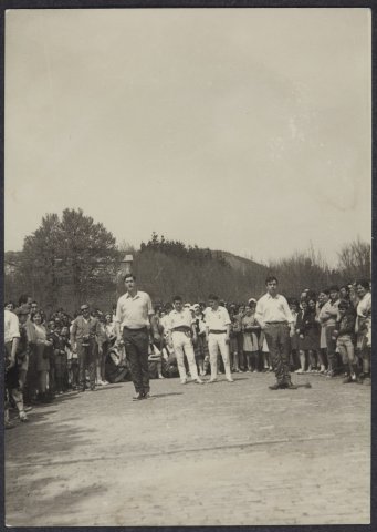Plaza batean lau dantzari daude. Inguruan ikusleak daude.