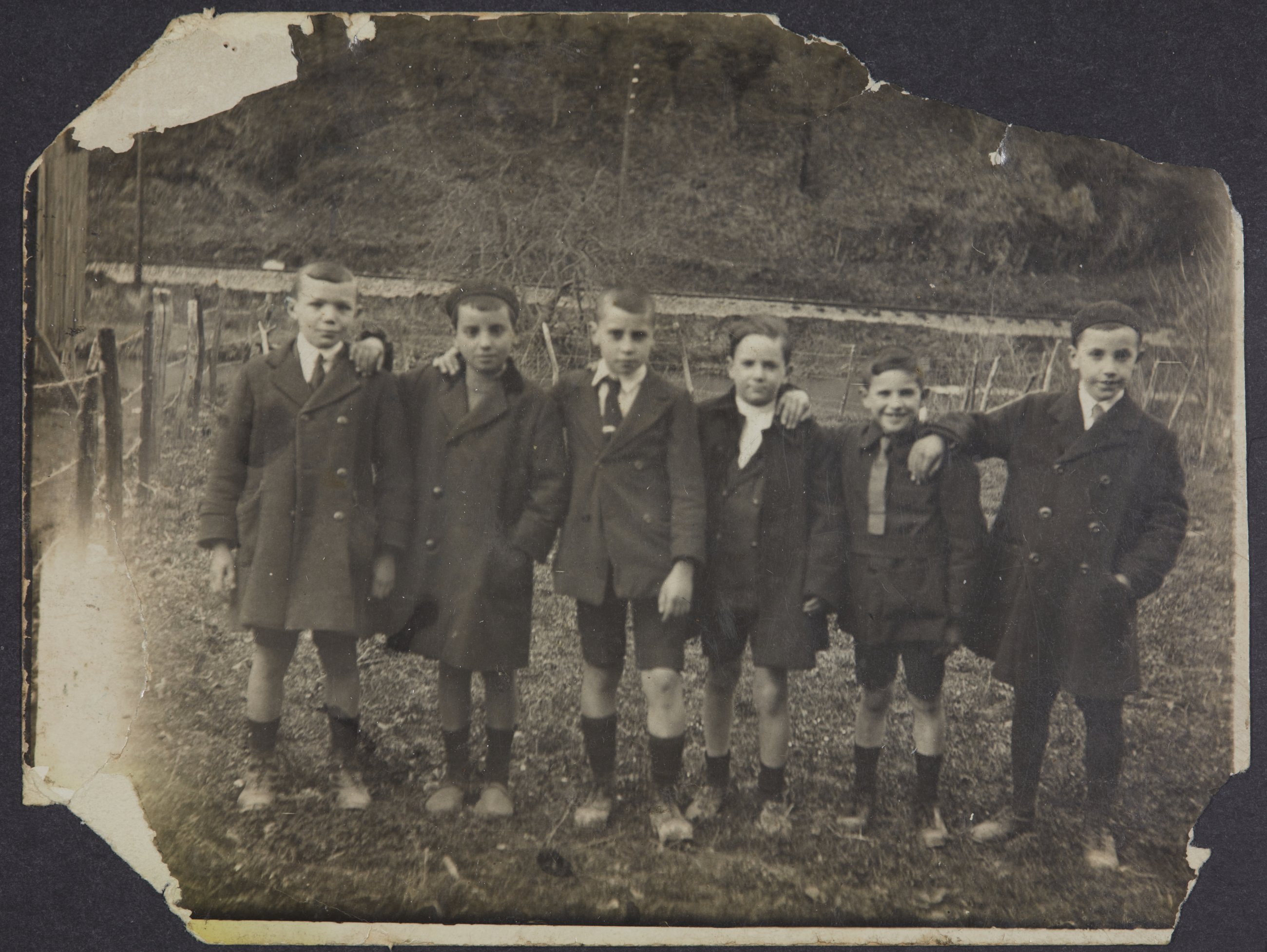 Argazkian sei ume daude traje eta gorbatarekin jantzita. Nekazal paisaian daudela atzematen da.