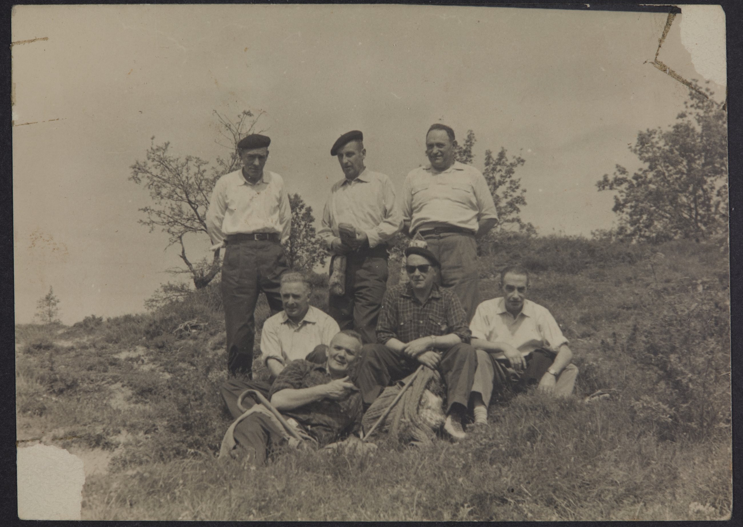 Mediko bateko aldapan mendizale batzuk zutik daude eta beste batzuk etzanda.