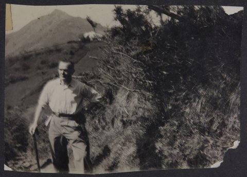 Mendi bat atzean duela gizon baten argazkia. Argazkiaren atzealdean "Julian Zabaleta Elgoibar" ipintzen du.
