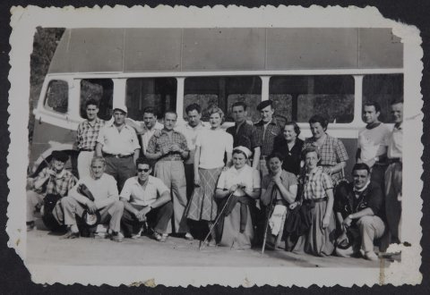 Mendizale talde bat autobus baten aurrean.