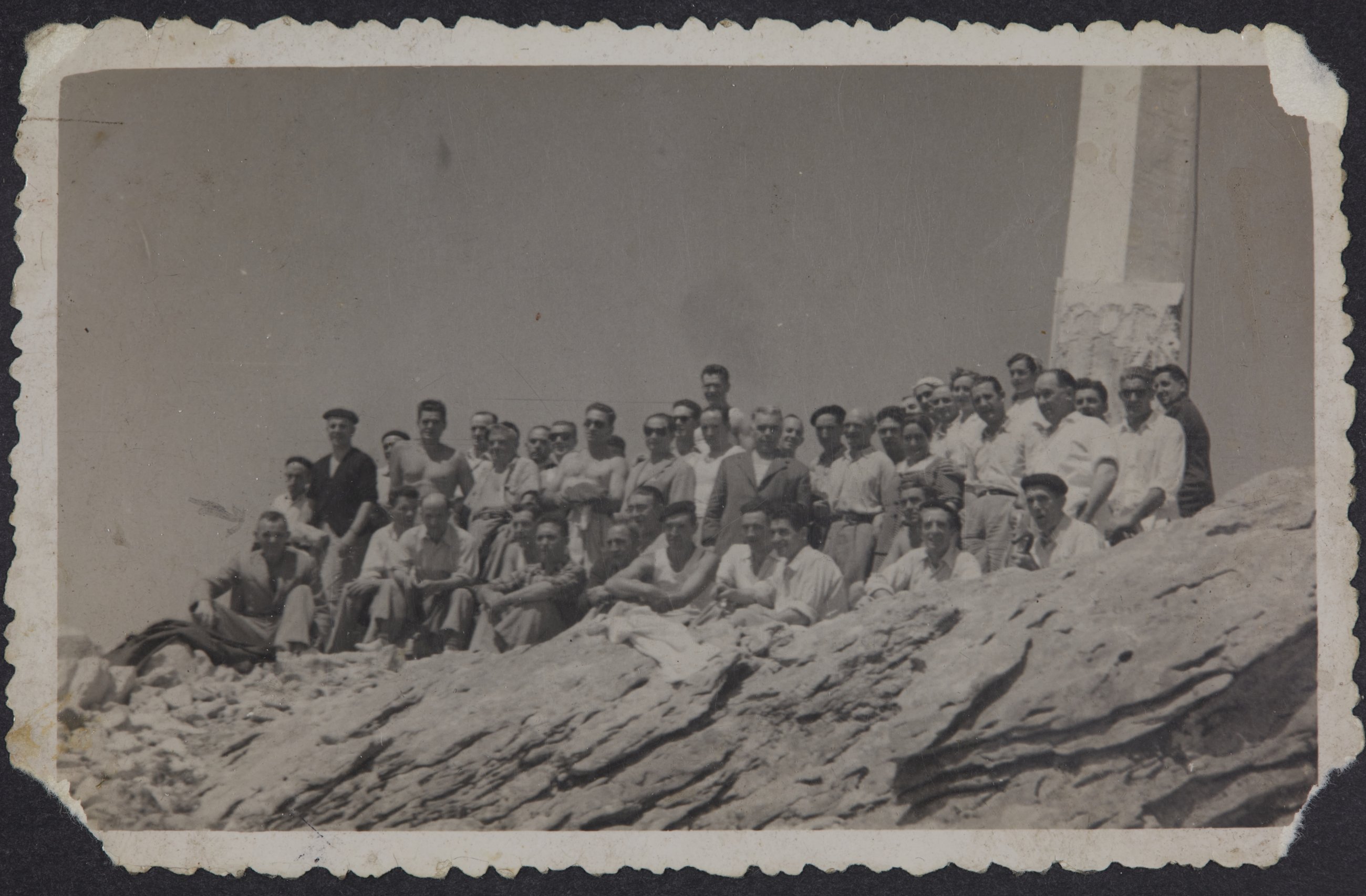 Mendizale taldea mendi baten puntan. Eskuinaldean gurutze bat dagoela antzematen da.